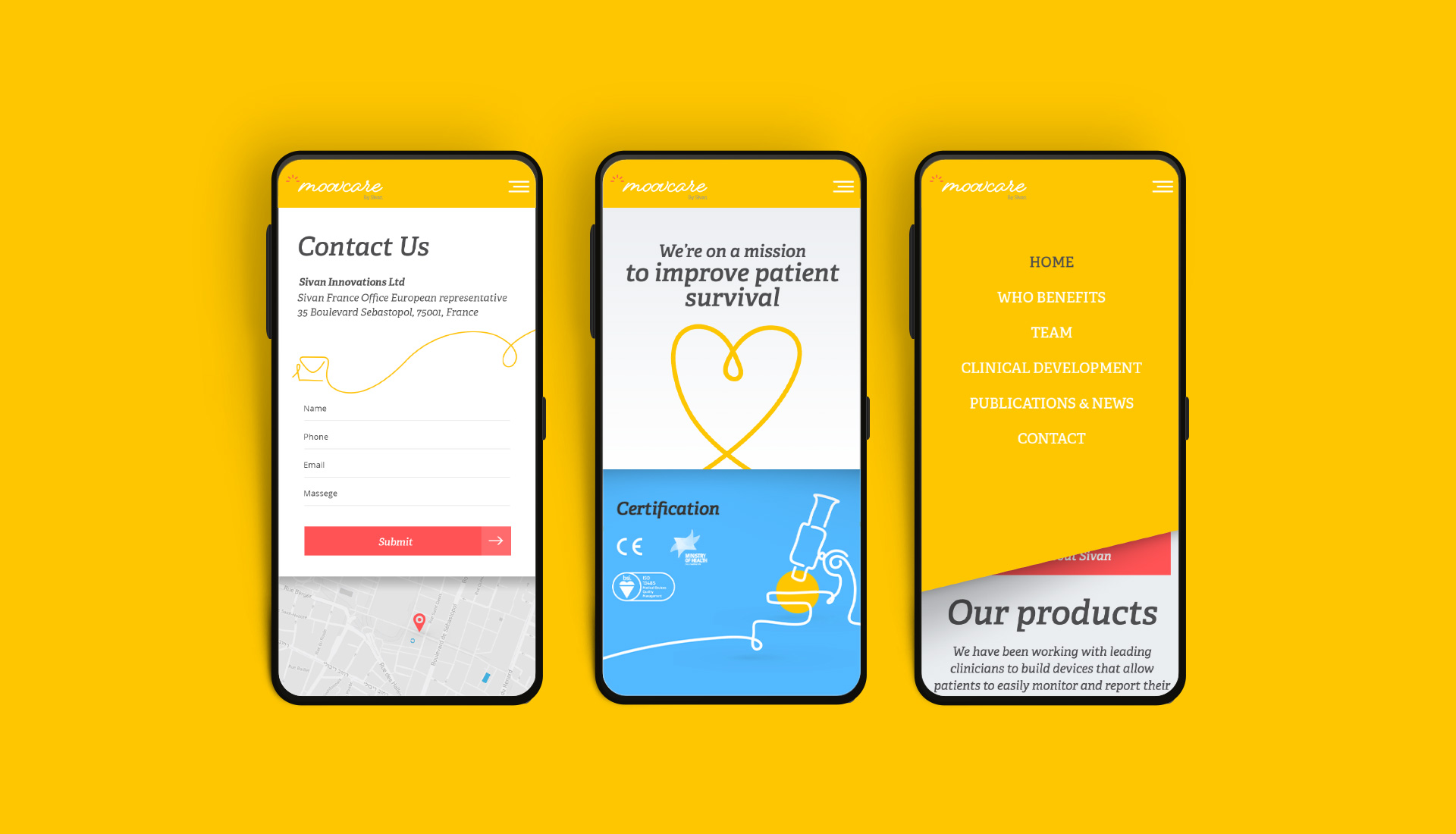 עיצוב ופיתוח מקבץ אתרים עבור חברת Sivan Innovation, המפתחת אפליקציות הנמצאות בשימוש בשוק הרפואה הבינלאומי. באתר נעשה שימוש בשפה חזותית ייחודית המבוססת איורים ואנימציות מורכבות. כל זאת כדי להעביר מסרים מורכבים בצורה מופשטת וקריאה. על מנת למקד את הפעילות למגוון קהלי יעד, תכננו אתרים נפרדים עבור אפליקציית ®Moovcare - מוצר הדגל של החברה, אתר נפרד לאפליקציית ®Smokecheck ואתר נוסף עבור חברת הפיתוח Sivan Innovation.